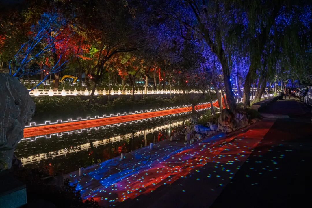 #美境游赏夜 游 北 护 城 河当暮色降临,北护城河的灯光亮起,浪漫而静谧的水岸空间,以水为纽带,透过建筑载体结构展现光的诗意,让自然风光与自然景观完美地融合在一起。这段景观步道长廊,长度约2.4km,沿线串连虹桥坊、红园、文汇阁等。水面夜景照明、两侧道路与绿化区相结合、相辅相成,让所有的夜景充满了灵动的气息。点点灯光如同萤火虫的夏日,告别一个季节的温度,又迎接一个季节的温润。在灯光的渲染下,波光
