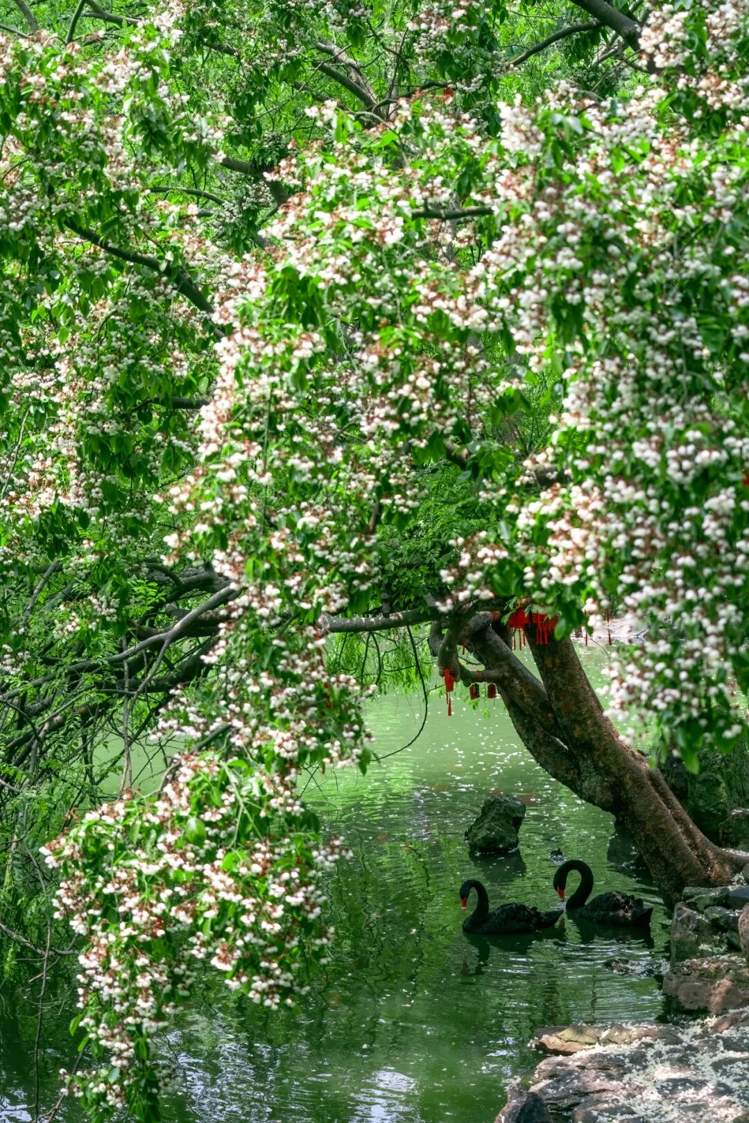 #美境游赏扬州大运河文化旅游度假区内的大明寺80多岁野生红豆树开花了。刻骨的相思,让时间变得温柔。不期而遇的美丽,让旅行充满惊喜。红豆树集珍贵用材、庭园观赏、森林文化于一体,是中华历史文化长河中的一枝灿烂之花。红豆树开花十分难得,一般5年左右才开一次花,甚至有的树会间隔8至10年。大明寺内这株红豆树于1980年移栽至大明寺内。当年,鉴真塑像回扬州“省亲”,绿化人员从常熟引进了这棵红豆树。今天有风,